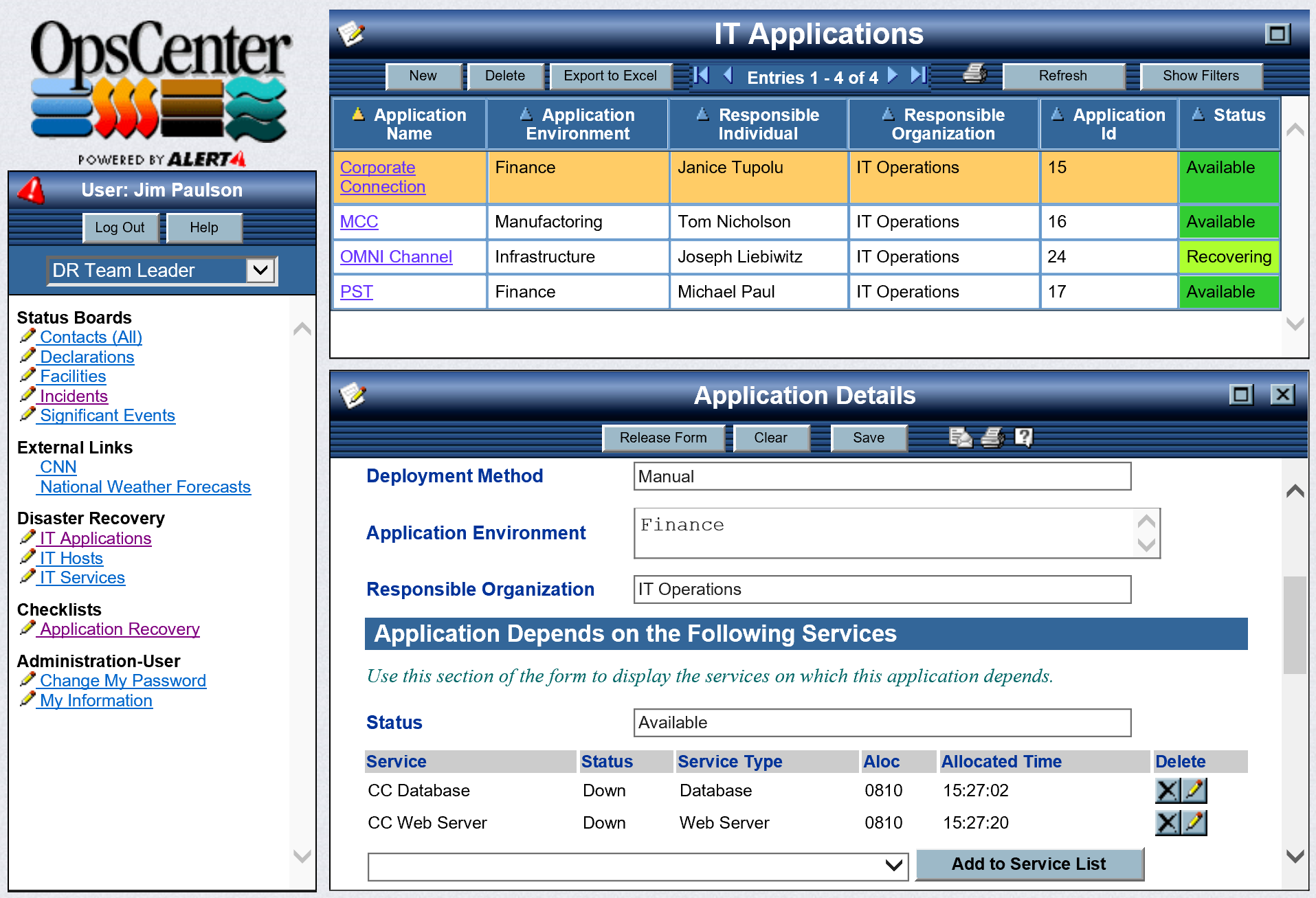 - The status of IT Services (databases, webservers, etc.) and the Applications they support